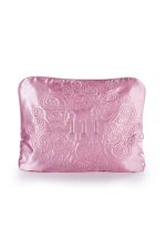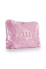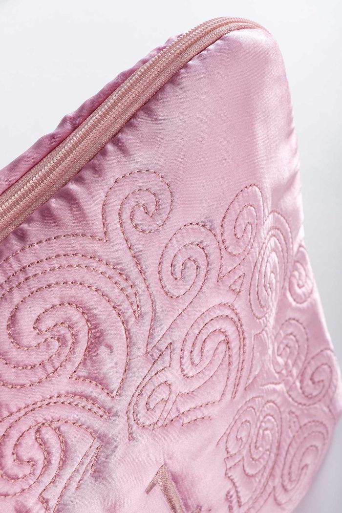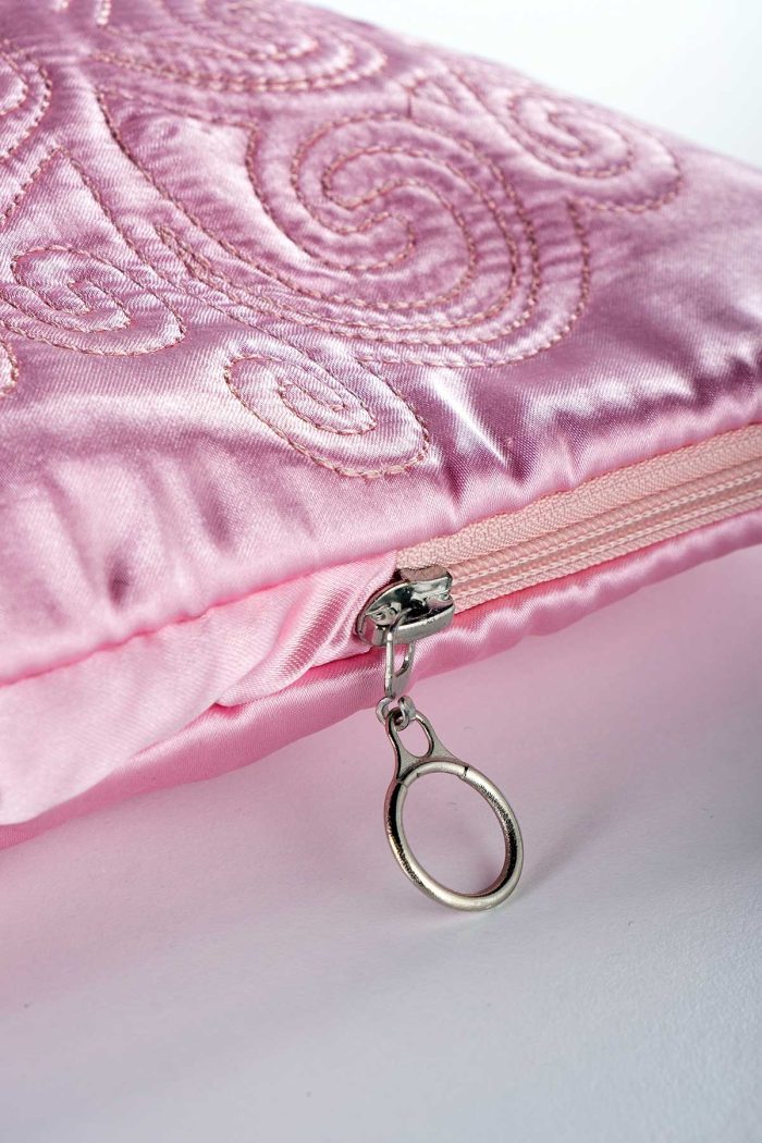 - Toz pembe ipek saten dış kumaşa sahip.
