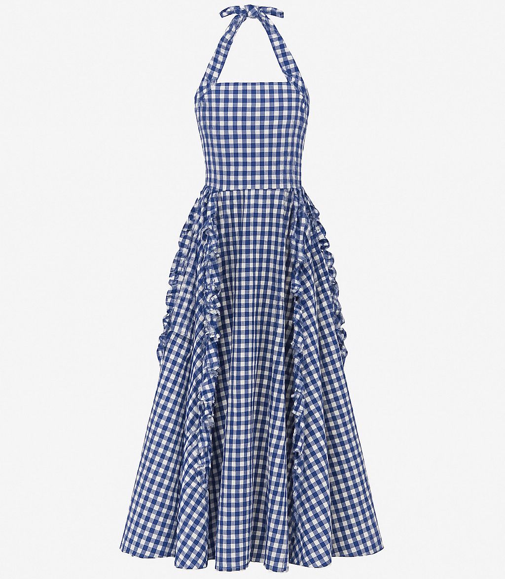 Bu zarif elbise, klasik mavi ve beyaz kareli desenli kumaştan tasarlanmıştır. Halter yaka tasarımı, boyun kısmında ince bir kumaş bağcığı ile tamamlanarak hem şık hem de rahat bir görünüm sunar. Elbisenin üst kısmı düz kesim olup, göğüs altından itibaren genişleyen bir etekle devam eder. Etek kısmı, kenarlarında dalgalı ve kat kat ruffle detaylarıyla süslenmiştir, bu da hareketli ve feminen bir siluet oluşturur. Orta uzunlukta olan bu elbise, günlük kullanımın yanı sıra özel davetler için de uygundur. Hafif ve nefes alabilen kumaşı sayesinde tüm mevsimlerde tercih edilebilir.