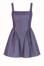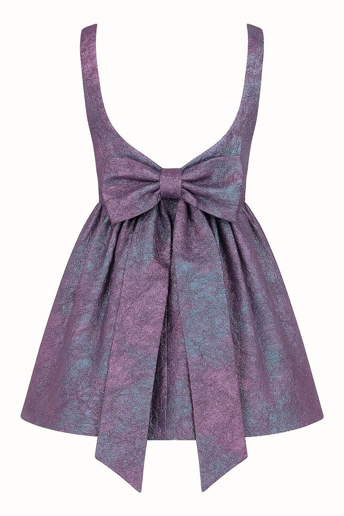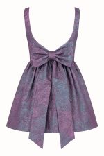 Arka kısmı açık tasarımıyla dikkat çeken elbise, geniş ve gösterişli bir fiyonk detayıyla süslenmiştir. Fiyonk, kumaşın doğal parlaklığı ve hafif dalgalı dokusuyla uyum içinde, zarif bir siluet oluşturur. Elbisenin etek kısmı hafif kabarık bir kesime sahiptir ve kumaşın üzerindeki ince çizgili desen, ışığa göre değişen hafif yeşil ve mor tonlarıyla modern bir görünüm sunar. Hem günlük şıklık hem de özel davetler için ideal olan bu elbise, konforlu ve nefes alabilen yapısıyla öne çıkar.