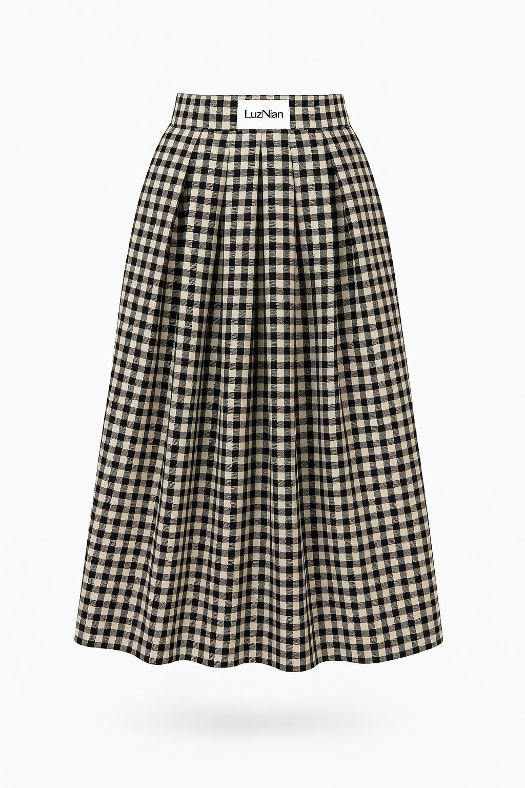 Siyah ve beyaz gingham desenli bu pileli etek, zamansız bir şıklık sunuyor. Pamuk oranlı kumaşıyla iç göstermez ve gün boyu konfor sağlar. Ön kısmındaki kemer detayı elegan bir görünüm yaratırken, arka kısmındaki lastikli tasarım rahat bir kullanım sunar. Yandan gizli fermuarı ile pratik bir şekilde giyilip çıkarılabilir.