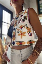 Geleneksel Çiçek Motifli Folk Nakışlı Beyaz Yelek